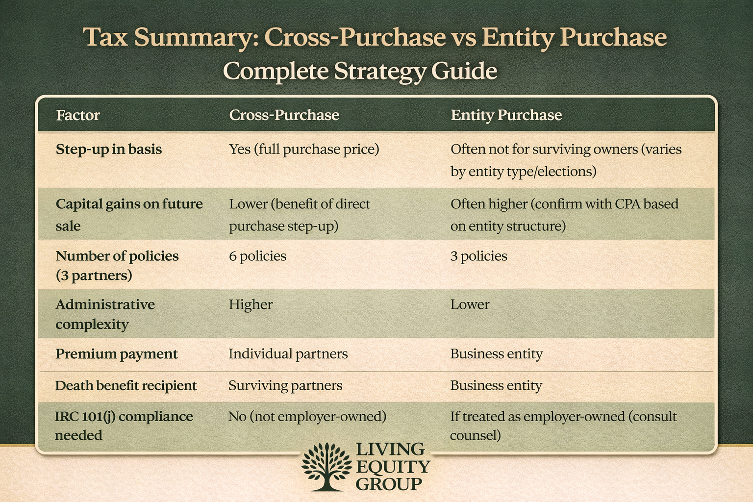 Tax treatment consideration: In many entity-redemption structures, surviving owners don't receive the same direct purchase-basis step-up they would under a cross-purchase, which can increase future capital gains. The outcome varies by entity type and tax elections (such as IRC Section 754 elections for partnerships), so confirm the specific tax consequences with your CPA based on your entity structure.